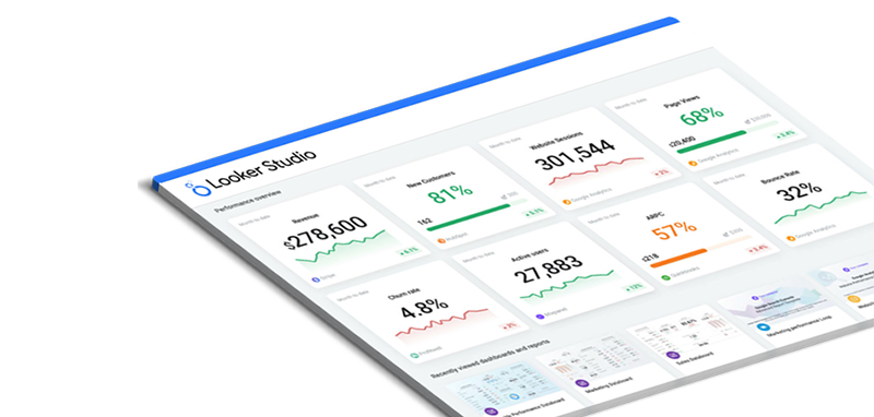 我们通过Google analytics 4 定制各业务端口的分析数据看板 ,为运营/投放人员提供处理细节问题的抓手,同时通过Looker Studio 帮助企业建立业绩KPI看板,驱动团队持续达成目标。