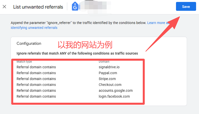 在“List unwanted referrals”页面,可以手动输入你希望排除的域名(如你的主站域名、子域名、第三方支付平台域名等)。输入完毕后,点击保存,设置即可生效。
