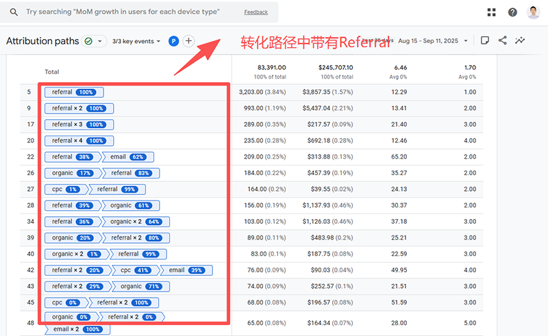 第2张图,转化归因路径,我提取了带有Referral 的归因路径,只是其中一部分,还有很多没有截取出来