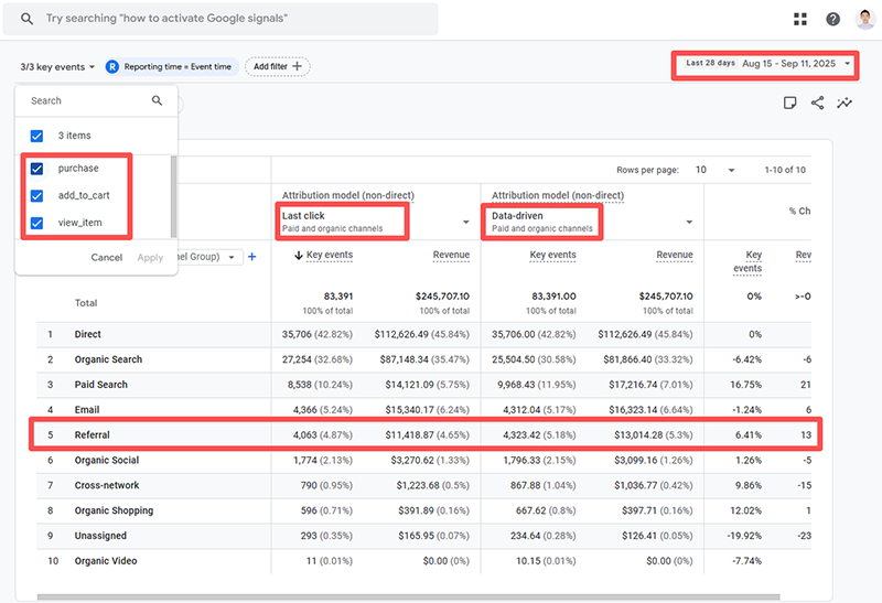 我们来看GA4后台近28天的销售报表,第1张是Referral 渠道在2种归因模型下的关键事件(view item, ATC, Purchase)的数据,可以看到Referral 在所有渠道中位列第5